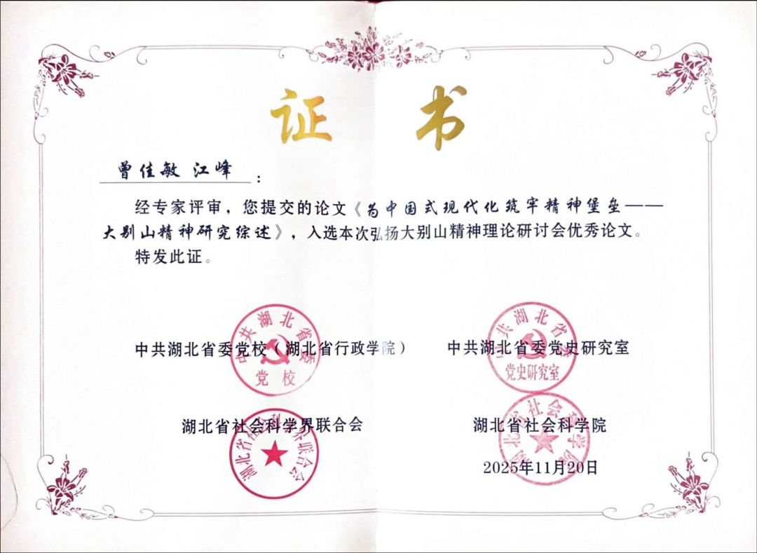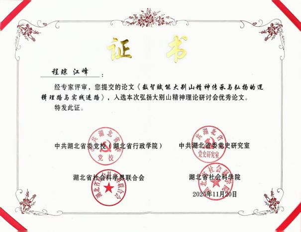 据悉,本次研讨会聚焦 “弘扬大别山精神” 核心主题,得到社会各界广泛关注与积极响应。经严谨评审,40余篇论文获评优秀论文。其中,湖师大马院入选的两篇论文,从数智化赋能传承和理论研究综述两个维度切入,既为大别山精神的社科普及提供了创新实践路径,也为相关领域的学术研究与科普工作梳理了清晰脉络。