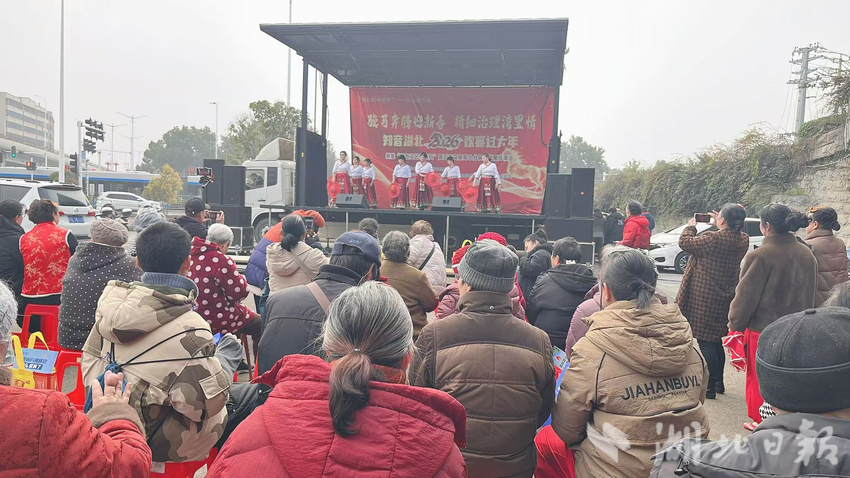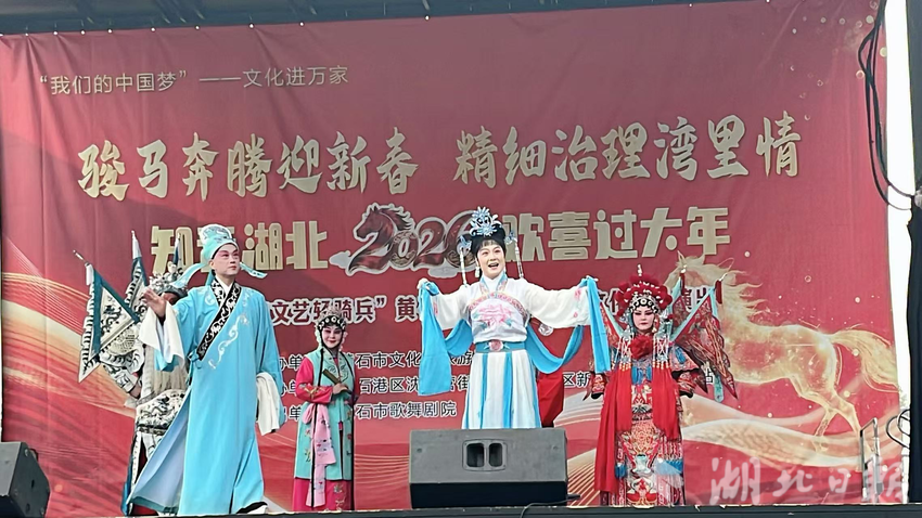 逛完 “微集市”,精彩的文艺汇演为居民带来了一场视听盛宴。星心港湾文艺队的舞蹈《我的中国心》、黄石市歌舞剧院带来的《大团圆》、歌舞《骏马奔驰保边疆》、小品《相亲》、市歌剧院演员潘樱演唱的《拜新年》……最后,《戏曲联唱贺新春》精彩收尾,韵味悠长的唱腔为整场活动画上圆满句号,现场掌声雷动、喝彩不断,气氛热烈非凡。