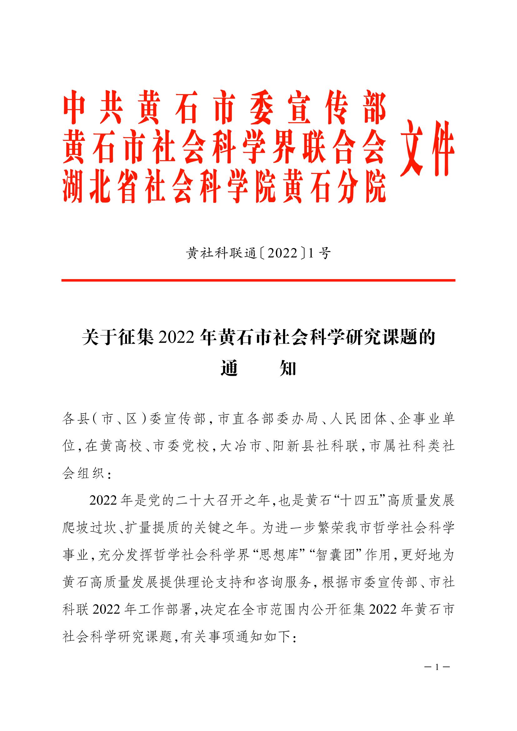 关于征集2022年黄石市社会科学研究课题的通知
