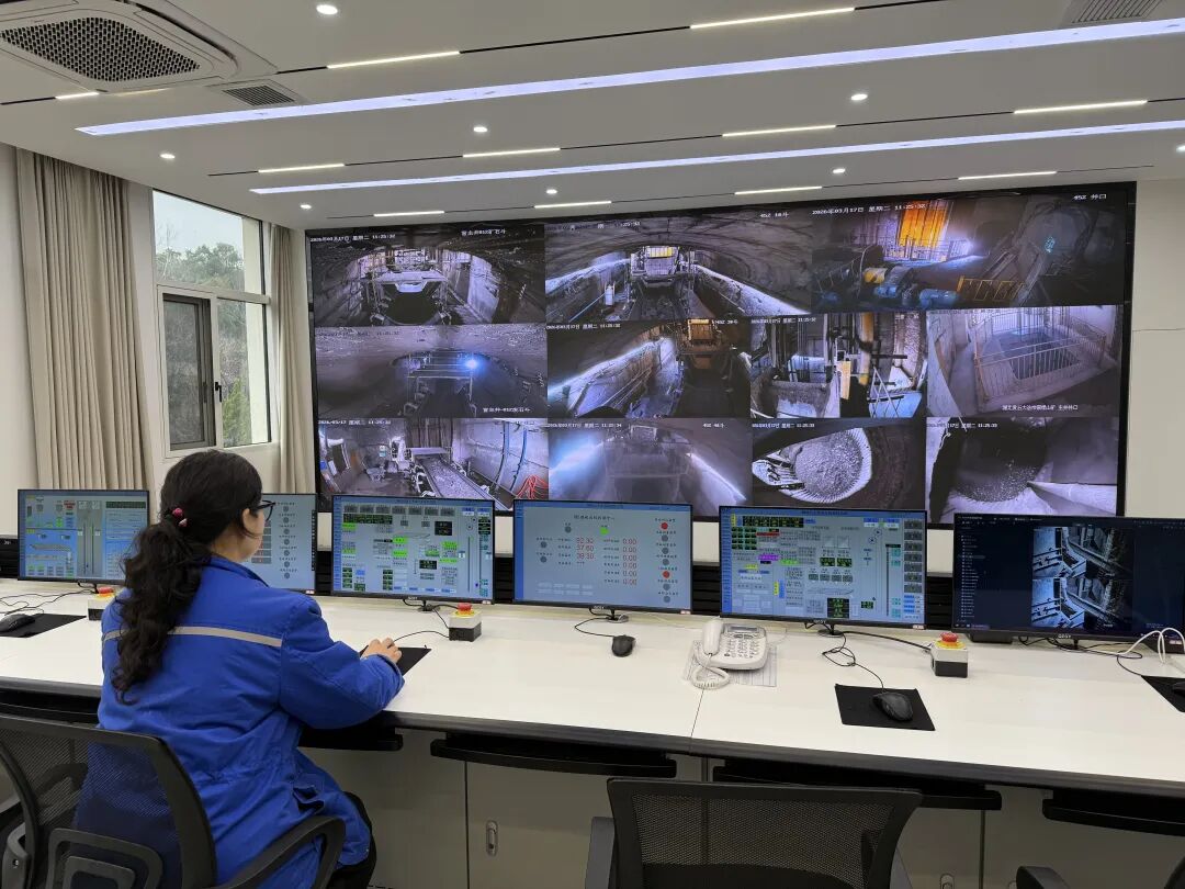 在综合车间远程主控室,监控大屏清晰呈现着井下的作业实况。这里,是井下矿石初破、运输和提升的“指挥中枢”。依托主井、盲主井和混合井三套提升系统协同作业,矿石先由盲主井从深部提升至主井中段,再经主井转运至地表,最终送往选矿厂。