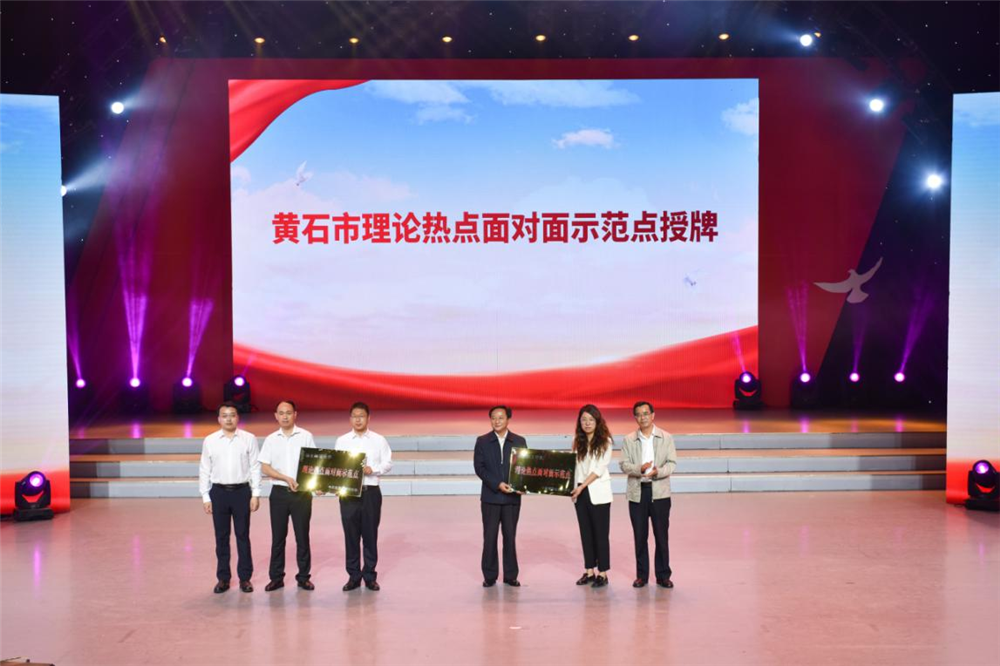 市委宣传部常务副部长杨国晋、市委宣传部副部长梅定祥为湖北师范大学与黄石港区沈家营街道、湖北理工学院与下陆区团城山街道两组对口单位授牌