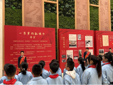 “同学们, 你们知道吗?我们胸前的红领巾,已经飘扬了一百年……”在红领巾讲解员的讲述中,队员们缓缓走进“一百岁的红领巾”主题展区。从“跟党求解放”到“迎来新中国”,从“成长在春天”到“逐梦新时代”,一张张泛黄的照片、一件件珍贵的实物,仿佛一扇扇时光之窗,无声地诉说着红领巾背后的峥嵘岁月。