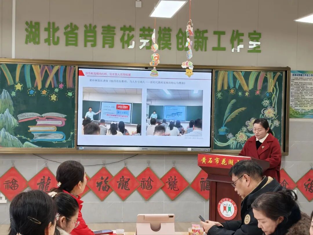肖青花副书记带领大家重温一年来的并肩足迹,每一幕剪影都镌刻着教育者的坚守与热忱。黄燕主任带来《以名师为灯 照育人之路》主题微讲座,结合黄石市名班主任研修中的真实案例,将 “立德树人” 的社科核心理念融入教学实践分享;退休教师涂美娟即兴创作《颂》,用深情文字赞颂师生同心、砥砺奋进的美好图景,让 “尊师重教”“团结协作” 的文明风尚自然流淌。