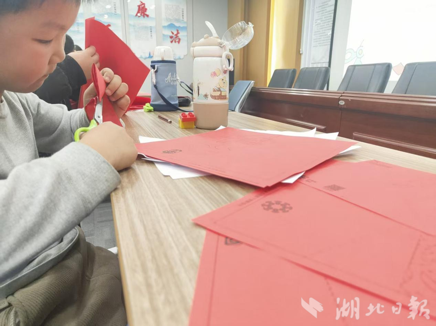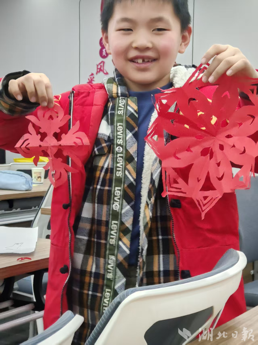另一边,大桥社区寒假爱心托管班内,一场热闹的剪窗花非遗科普课程正精彩上演。社区志愿者化身民俗科普老师,用卡通图片和趣味问答,为孩子们讲解窗花的吉祥寓意。