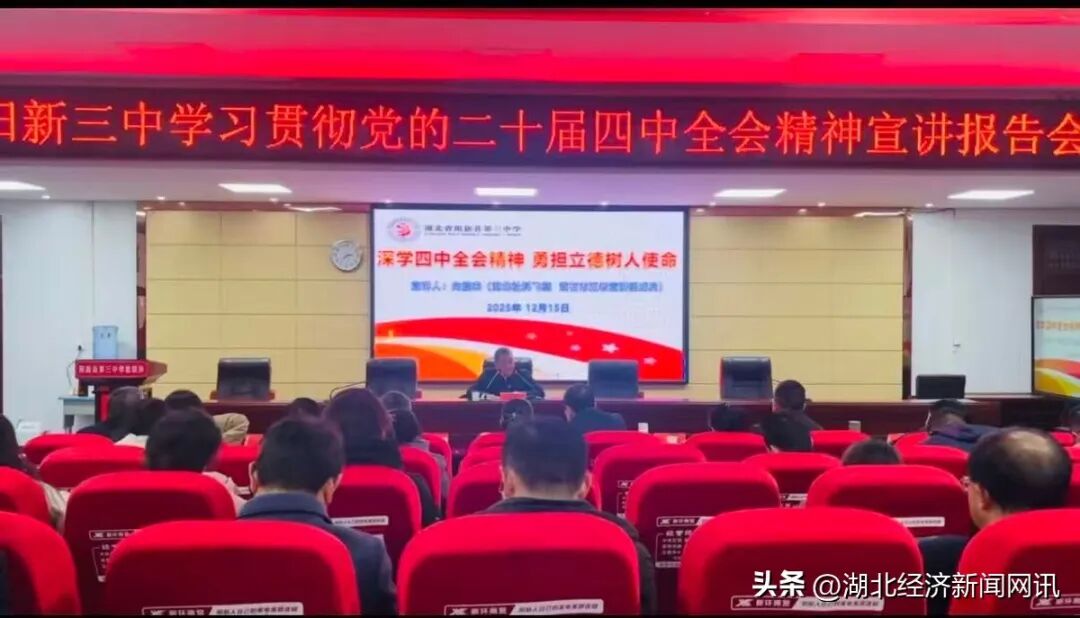 12月15日下午,湖北社科飞燕、阳新富川飞燕宣讲员向能来到阳新县第三中学,他以《深学四中全会精神、担当立德树人使命》为题,全面宣讲了全会及《建议》的重要意义、“十五五”时期相关部署、“十四五”时期重大成就,阐述了坚持党的全面领导、推进教育高质量发展、落实立德树人根本任务的相关要求。