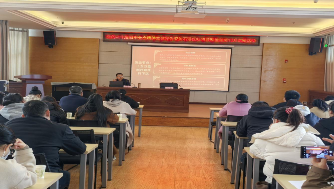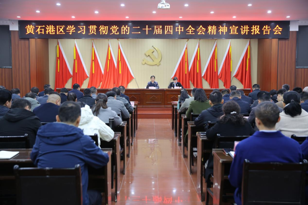 12月10日,黄石港区召开党的二十届四中全会精神宣讲报告会,会议强调要深学细悟全会精神实质与丰富内涵,把思想和行动统一到党中央决策部署上来,紧扣 “十五五” 发展要求,对标省市区委全会安排,以临空高端商务区建设为核心,构建建特色临空产业体系、深化改革,抓实安全环保等工作,推动全会精神落地见效。 12月17日,黄石港区社科联携手区图书馆开展 “学悟全会精神 笃行社科新程” 主题社科普及活动。区社科联各成员单位代表齐聚一堂,以专题宣讲、实地观摩、交流探讨的形式,学思践悟全会精神,共探社科普及新路径,为港区高质量发展凝聚社科智慧、注入智力动能。