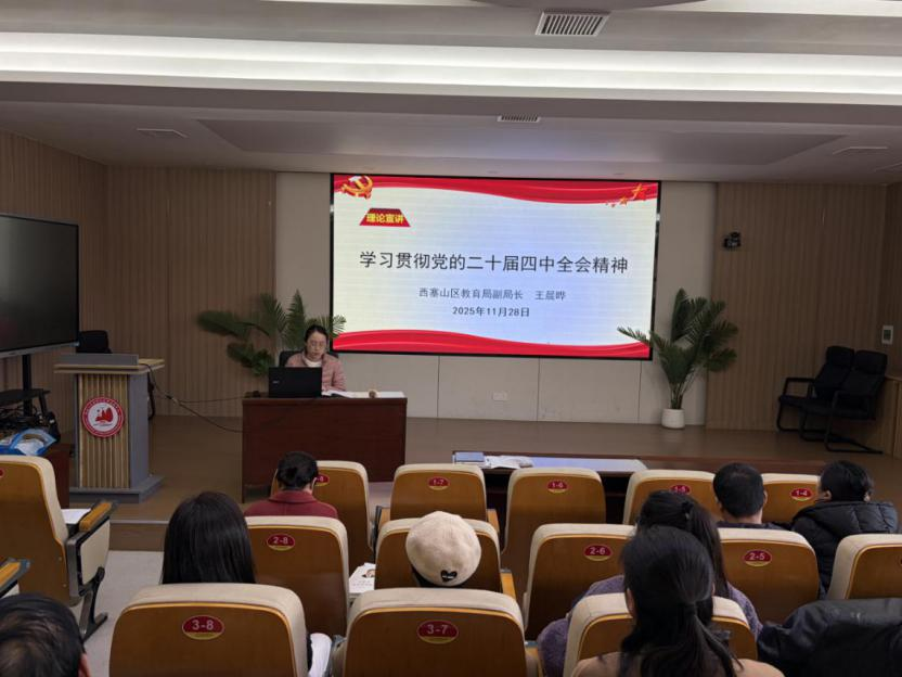 11 月 28 日下午,区社科联副主席、区教育局副局长王晨晔在黄石市中窑小学开展党的二十届四中全会精神主题宣讲。宣讲以 “学习贯彻党的二十届四中全会精神,加快推进区域教育高质量发展” 为主题,结合区域教育实际与 “十五五” 规划建议,围绕全会意义、“十四五” 教育成就、“十五五” 部署、教育科技人才一体推进及全面从严治党等内容进行系统阐述。