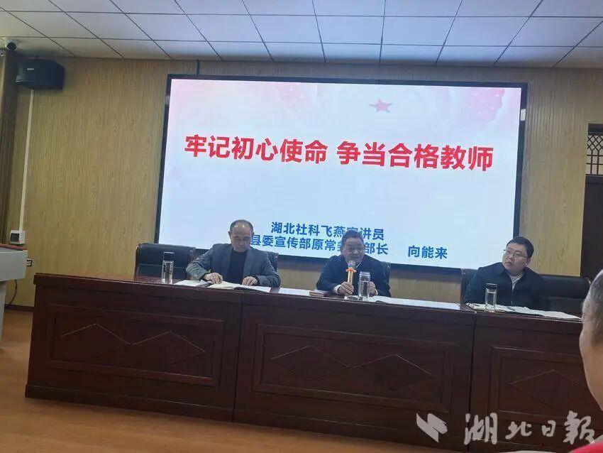 为强化教师思想政治建设,提升乡村教师育人素养,4 月 24 日,阳新县木港镇教育党总支开展 “牢记初心使命 争当合格教师” 大思政课宣讲活动。活动借力东楚飞燕宣讲品牌力量,邀请湖北社科飞燕、县关工委副主任向能来现场授课,全镇教育系统党员干部、班主任及教师代表 80 余人参与学习。