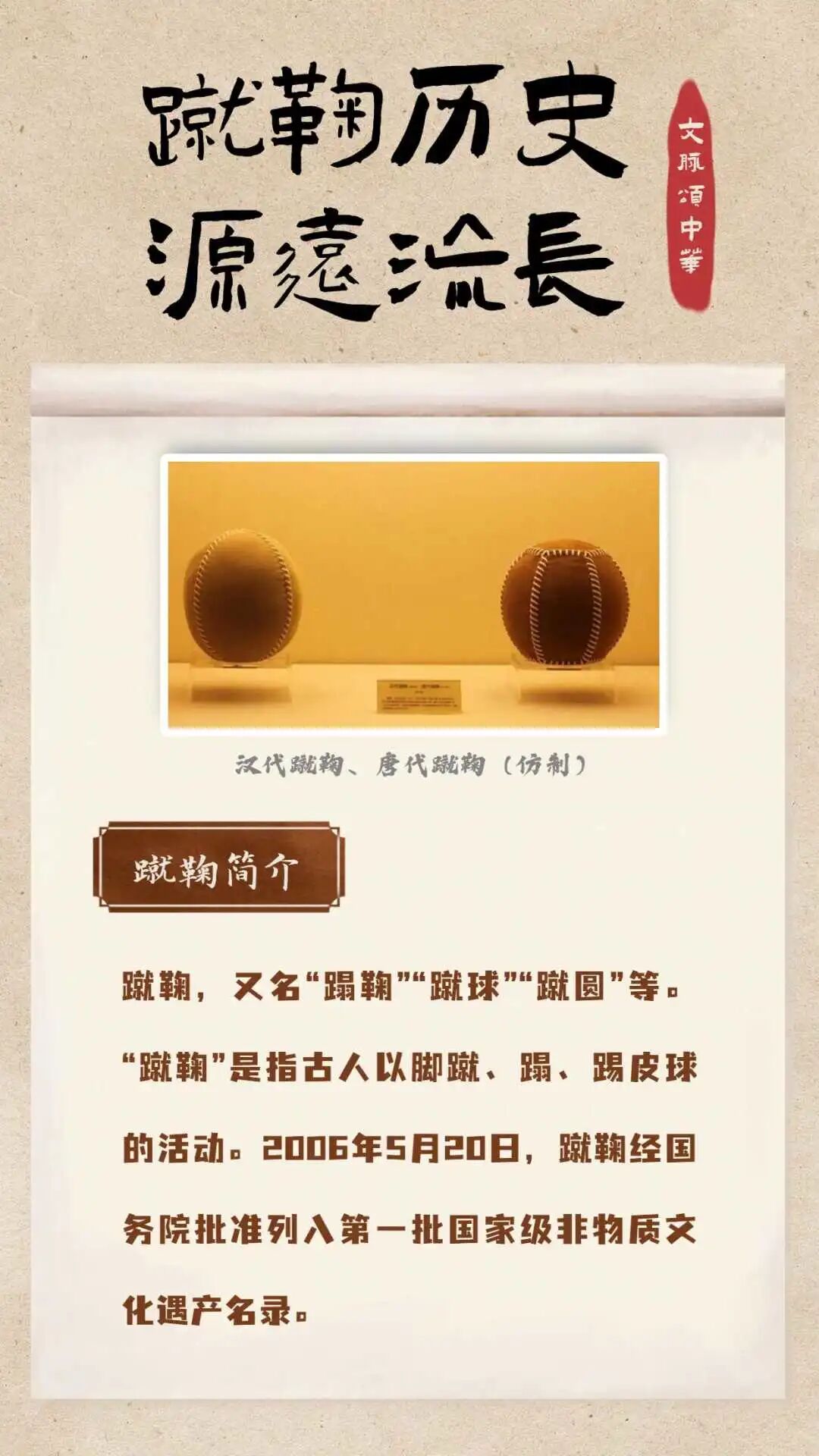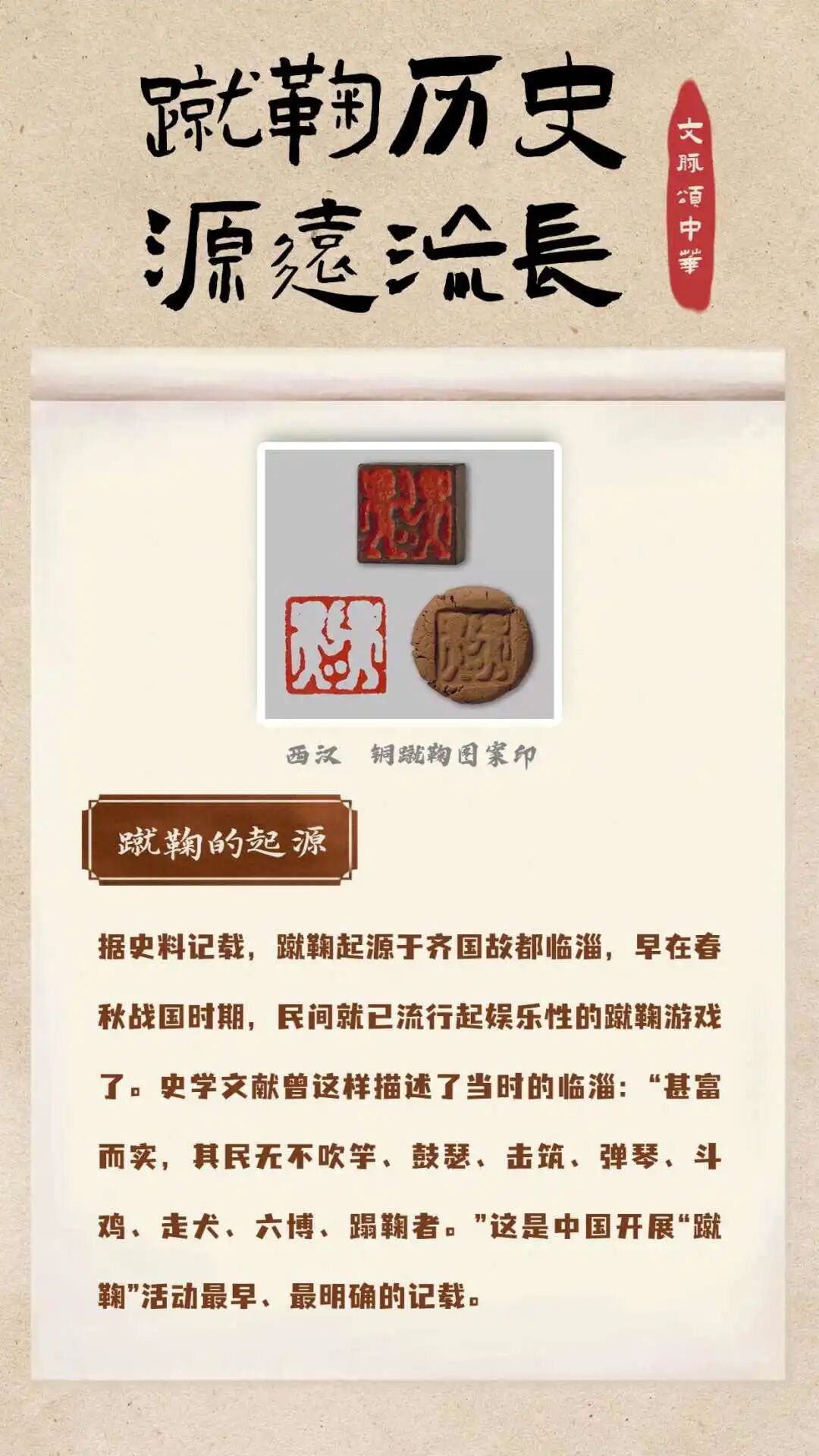 中国蹴鞠作为一项有着两千年历史的足上球类运动,在2004年被国际足联正式确认为世界足球运动起源,在2006年被列入第一批国家级非物质文化遇产名录。蹴鞠的历史源远流长,早在春秋战国时期,蹴鞠游戏就已在民间流行,此后的各个朝代,蹴鞠也广泛地受到人们的喜爱。